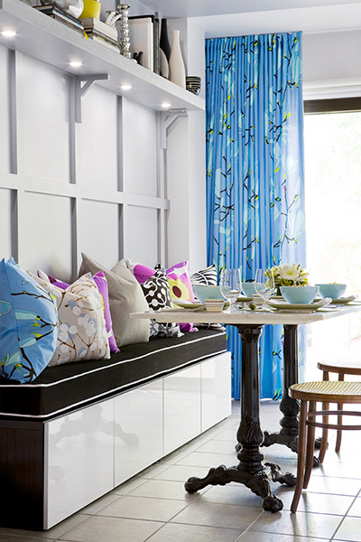 ^ Designer Samantha Pynn livens up a black and white scheme with these blue floral curtains. The fabrics are from