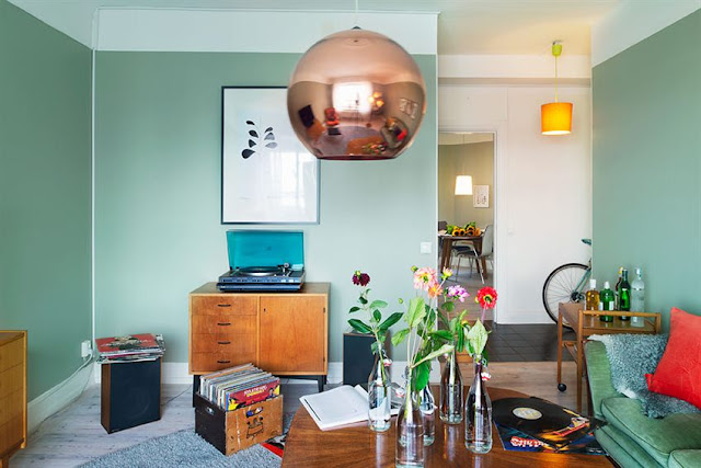 Copper Shade Pendant by Tom Dixon make for a very cool home, in my eyes. And I love the small details too such as the siver birch tree trunk in the hallway used as a coat stand - potential DIY project?